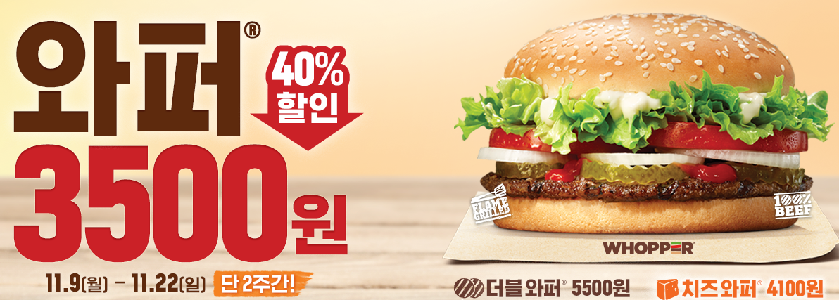 와퍼 행사 기간은 : 11월9일 ~22일까지 입니다.