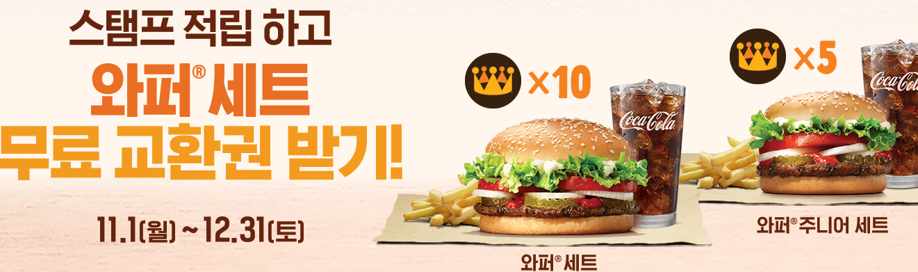와퍼세트 스탬프 10, 주니어 세트 스탬프 5 스탬프 5개 적립하면 와퍼주니어 세트,