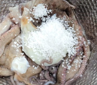 밀가루로 주물러 주시다 보면 거품이 생기실 때 문어에 굵은소금을 뿌린 후 빡빡 문지르면