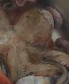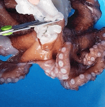 문어 대가리를 한쪽으로 뒤집어 내장을 제거해 줍니다. 다리 중간에 있는 이빨을 제거하시면 됩니다.