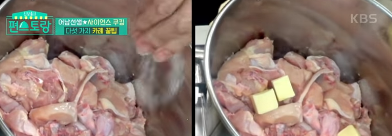 - 버터를 넣고 버터가 녹으면 닭고기를 넣은 상태에서 건드리지 않은 상태에서 눌어붙을 때까지
