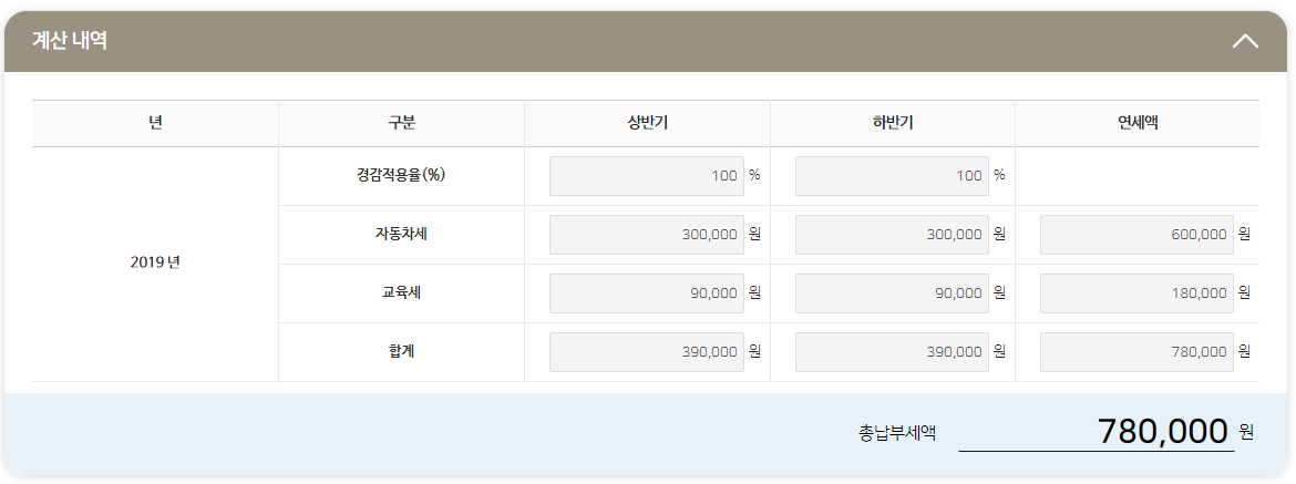 자동차세 산출 내역 : 경감 적용률, 자동차세, 교육세 합계금액이 나오네요