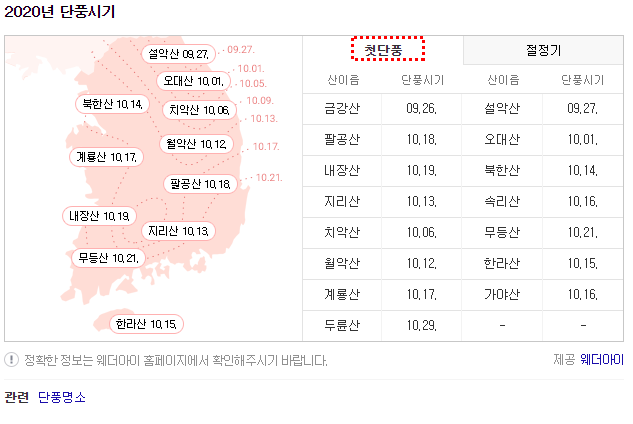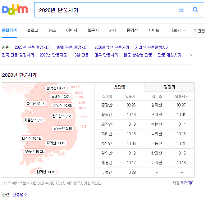포털사이트 다음에서도 2020년 단풍시기에 대해서도 간략하게 나와 있습니다.