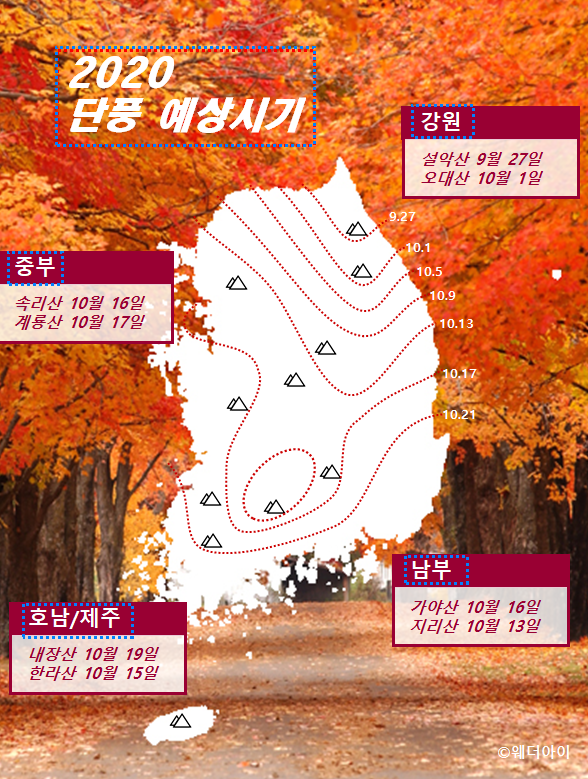 웨더아이에서 제공하는 2020년 단풍 절정시기를 알아보도록 하겠습니다.