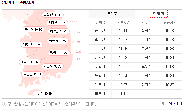 2020년 단풍 절정시기에 대해서 알아봤습니다. 산행시 거리두기 잊지 마시구요