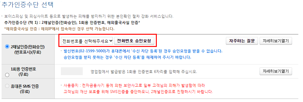추가 인증수단 선택 방법은 2 채널 인증(전화승인) 및 1회용 인증번호 선택.