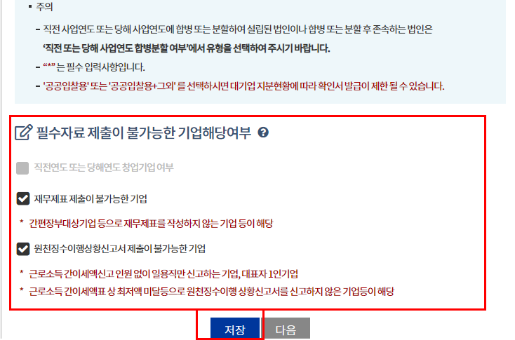 재무제표 제출이 불가능 기업(간편 장부 대상 기업) 해당 체크.