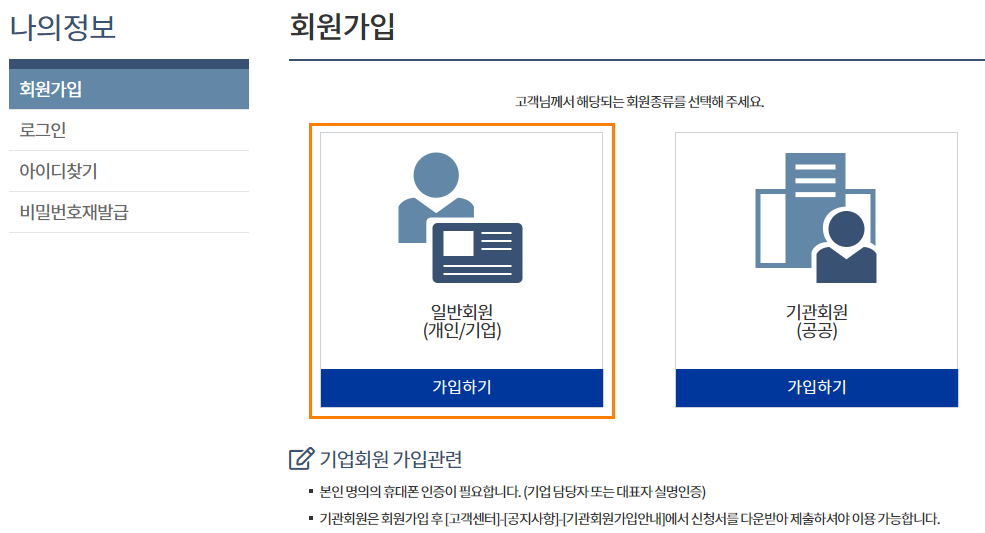 약관 동의 후 개인 실명인증 이용자 정보와 기업정보 입력하시면 됩니다. 또한 직원이 가입하셔도 됩니다.
