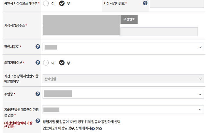 확인서 지점 정보 표기 여부, 확인서 용도, 주업종 등을 선택하시면 되는데요 이 부분은 크게 중요하게 없는 것 같아요.
