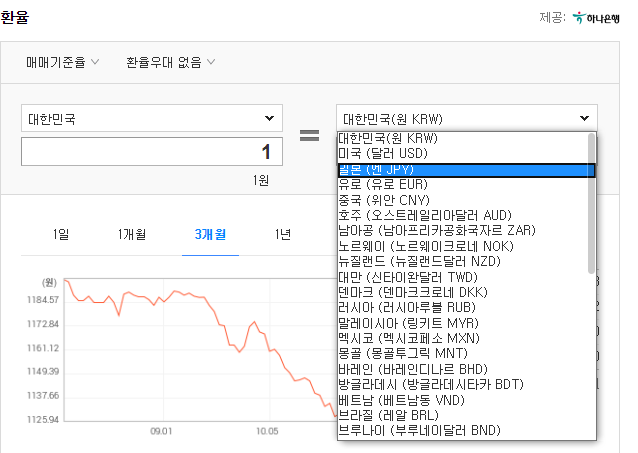 각 국가별로 환율이 나옵니다. 본인이 원하시는 국가를 선택하신 후