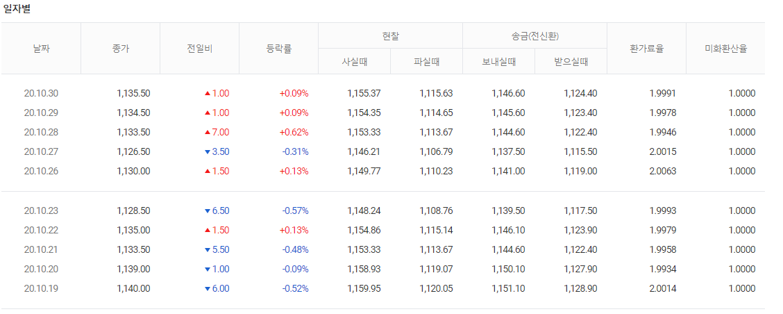일자별로 환율 종가 등락률 현찰을 사실 때/파실 때 송금관려도 자세히 보여줍니다.