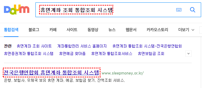 다음이나 네이버 포털에서 휴면계좌 조회 통합조회 시스템 검색 후