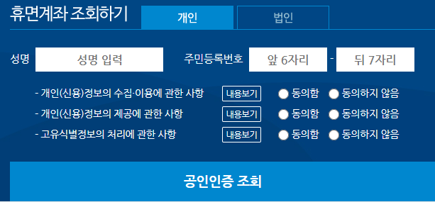 휴면계좌 조회 방법은 간단한데요 가입 없이 성명, 주민번호, 입력 후 공인인증서 로그인후